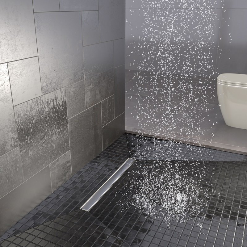 Лоток пластиковый, анти-ударный, решетка металлическая, сифон полипропиленовый, диаметр сливного отверстия 50мм, поворотный 360. Ножки регулируемые.