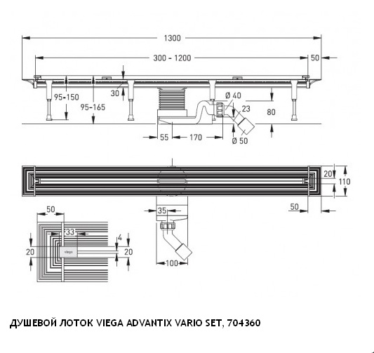 Душевой лоток Viega Advantix Vario 704360, с щелевой вставкой хром, опорами, подрезной от 30-120 см