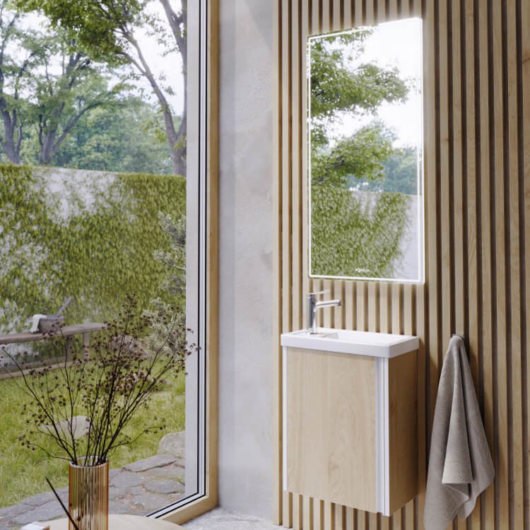 Подвесная тумба 45 см с одной универсальной дверью в цвете дуб балтийский, с умывальником Подвесная тумба 45 см с одной универсальной дверью в цвете дуб балтийский, с умывальником
