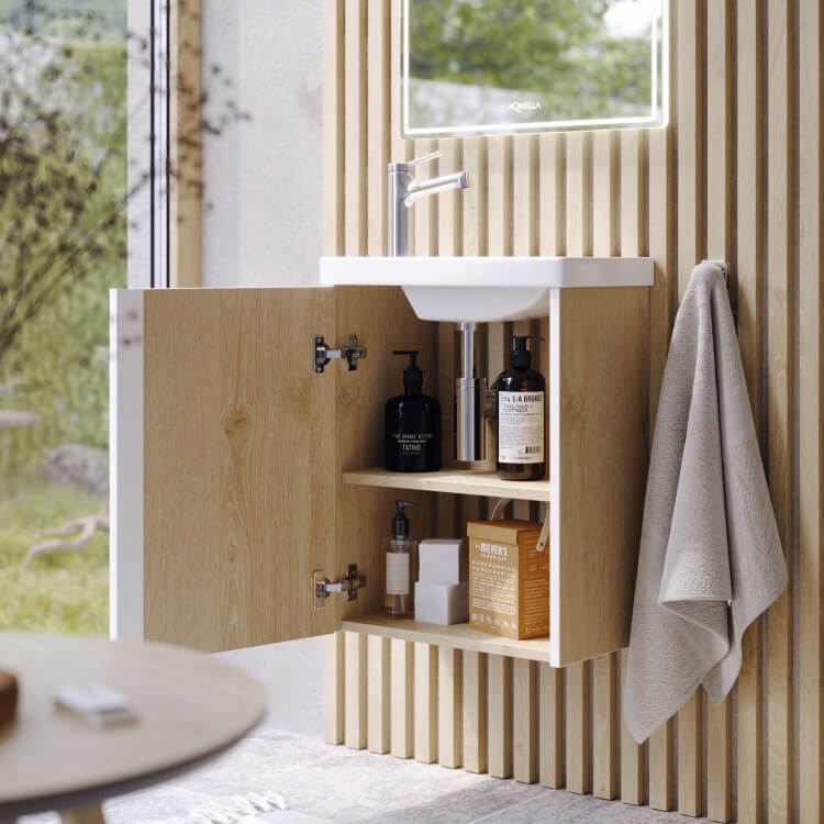 Подвесная тумба 45 см с одной универсальной дверью в цвете дуб балтийский, с умывальником